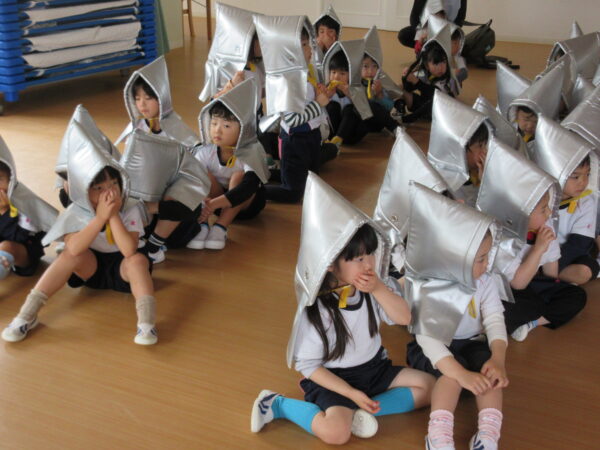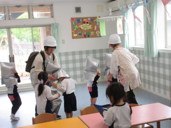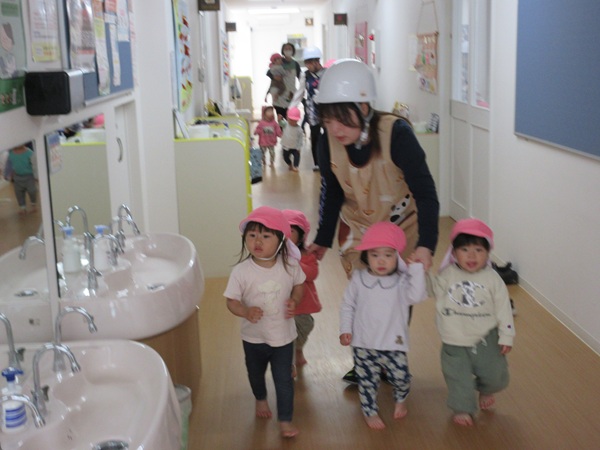 以上児クラスは、防災頭巾をかぶり、未満児クラスはカラー帽子をかぶって、担任の先生たちと一緒に避難します。