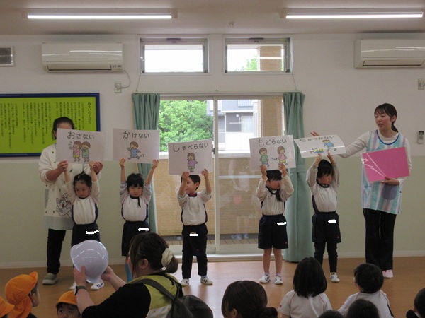 ホールに集まったお友だちも、今日は火災想定なので、煙を吸わないように