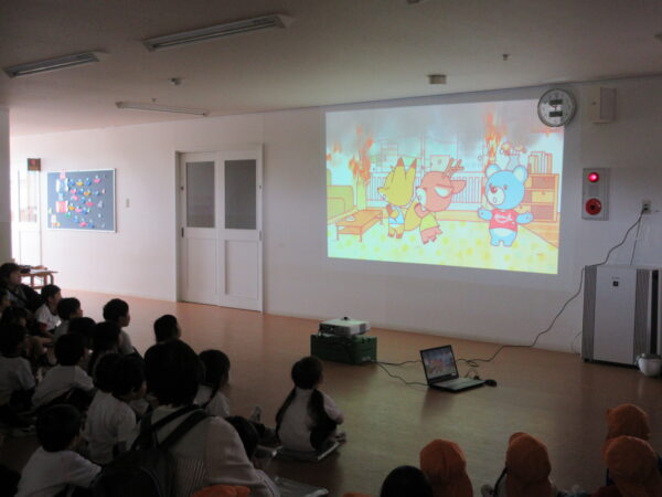 「給食室から火災が発生しました。先生の言うことをよく聞いて、2階のホールに避難してください。」と、放送が流れます。
