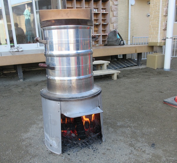 まずはモチ米を蒸しましょう。モチ米は昨日さくら組のお友だちが洗ってくれたので、一晩水につけておきました。
