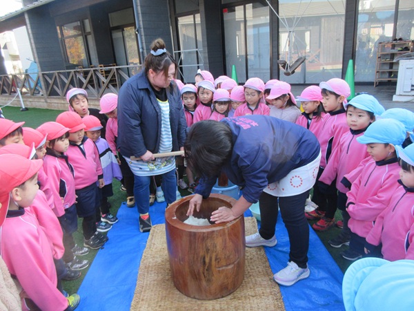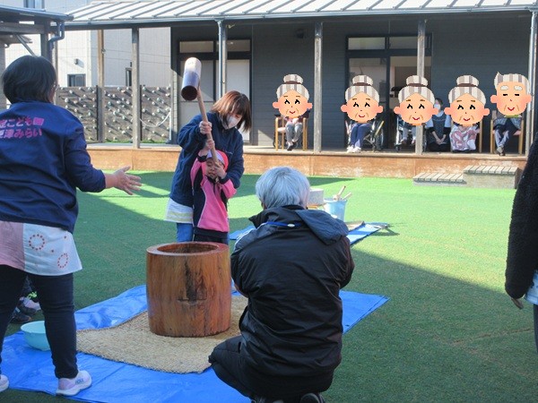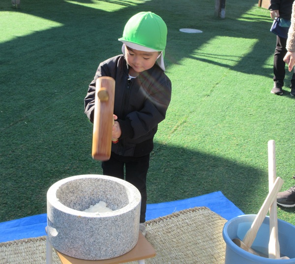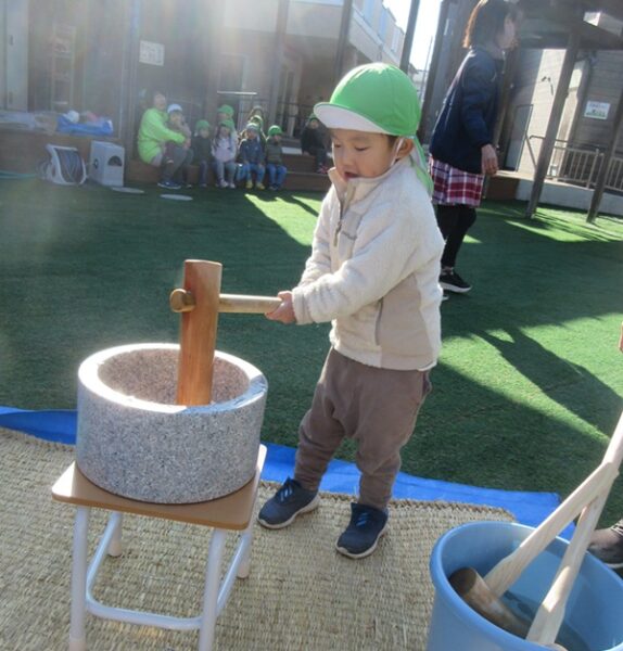 小さなお友だちは小さな臼で「ぺったんこ!」