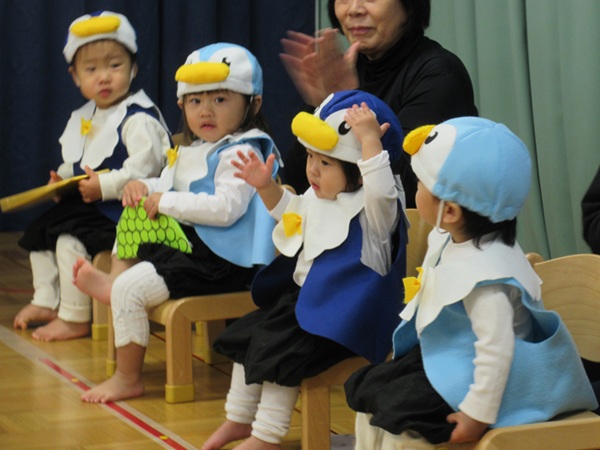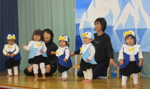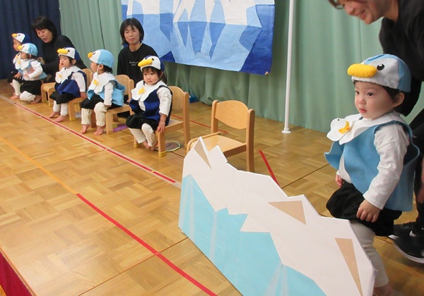 最初にひよこ組の発表。ひよこ組はペンギンに変身!氷山から「いないいないばあっ!」と元気に登場!