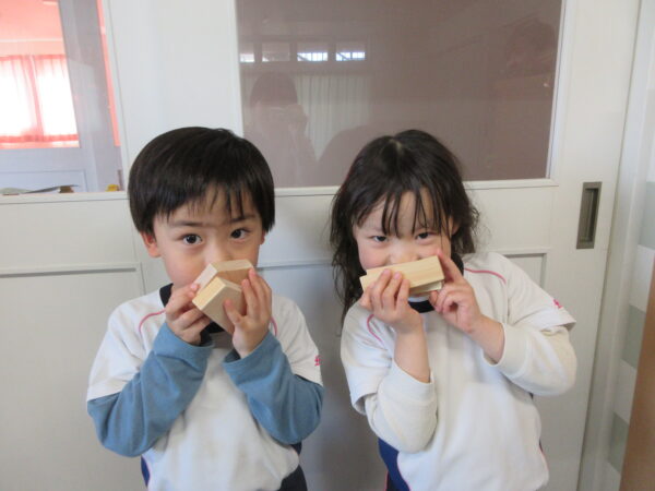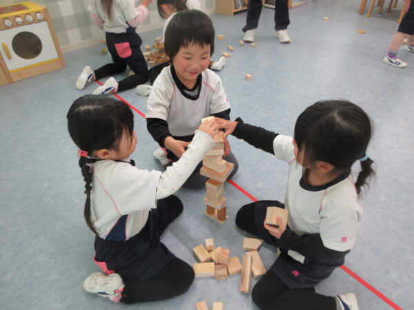 今日は、大工さんが余った木材で作ってくれた「積み木」を使ってゲームをしました!「木のいい匂いがする~」と興味津々な子どもたち♪