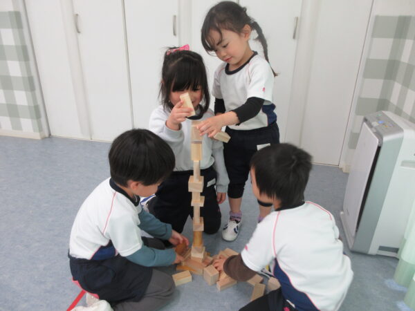 テーブルのグループごとに分かれ、どのグループが1番高く積み木を積めるか勝負です✨