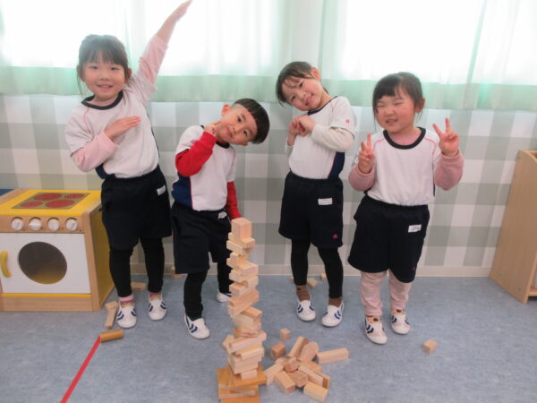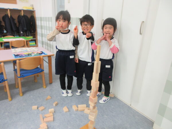 結果はみどりテーブルが1位⭐子どもたちの胸の高さまで高く積み上げることができ、他の子どもたちや先生たちも思わずびっくりです👀おめでとう~!