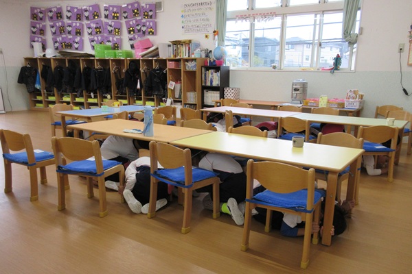 さすがさくら組!地震発生を知らせる放送を聞くと、素早く机の下に入り、机の脚をしっかり握って身を守っています。
