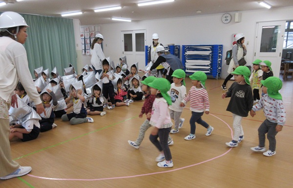 ひつじ組も先生のお話を聞いて、静かに避難しています。