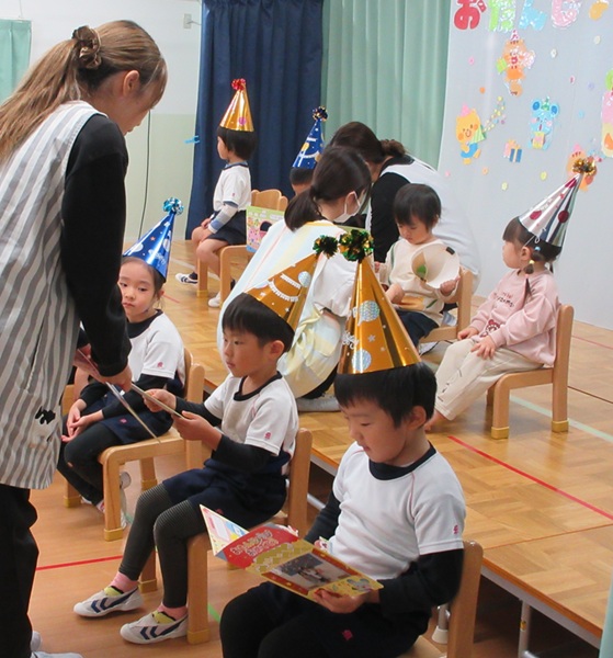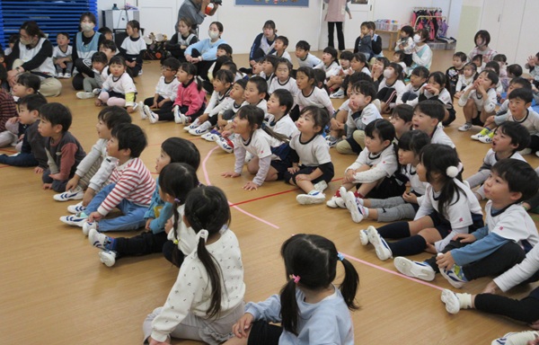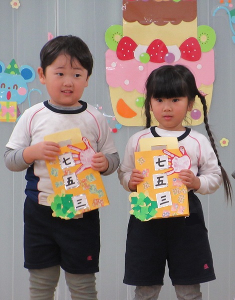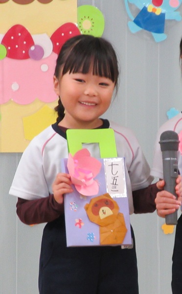 今日は11月生まれのお誕生会と、明日が七五三の日ということもあり、子どもたちの成長を祝い、またこれからの健康を願って、七五三集会を行いました。