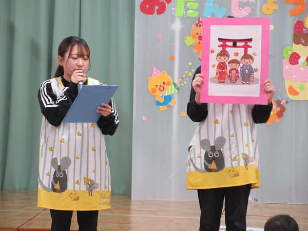 楽しいお話の後には七五三の由来や千歳飴についてのお話を聞いたり